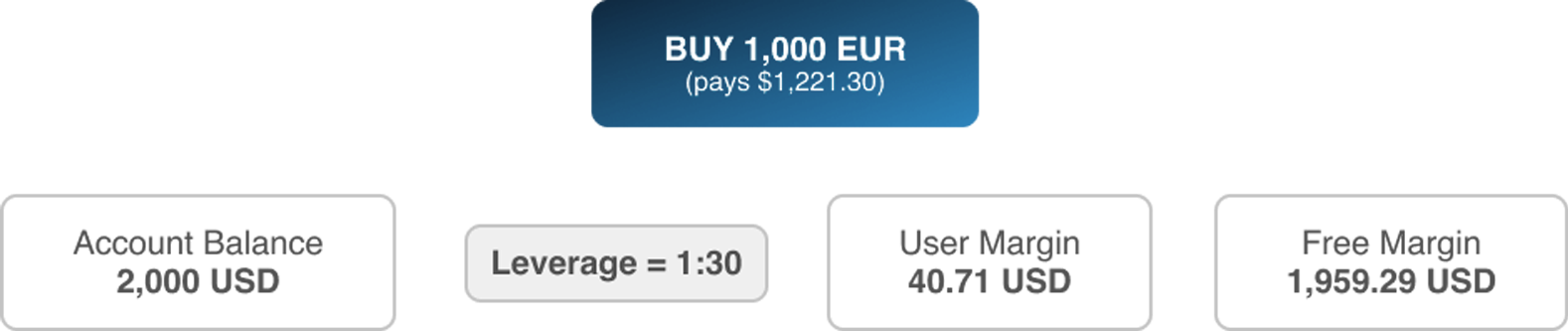 One of the advantages of CFD-trading is that you may trade with leveraging effects, thus requiring less money to open a trade. Trade Markets offers a leverage of 1:30 for trading with EUR/USD, i. e. you only need to provide a margin of 3.33%, to open a position.