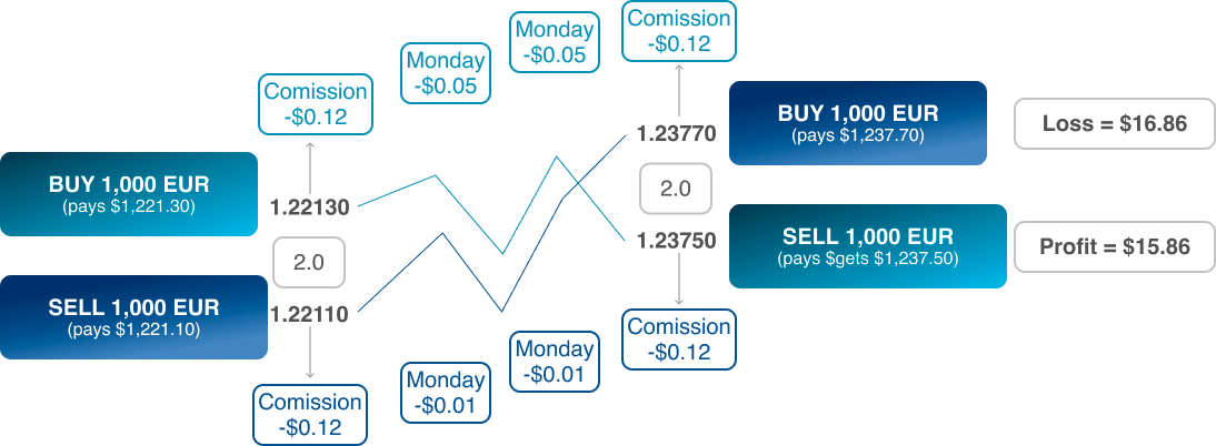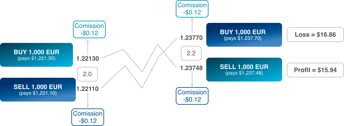 Commissions are charged when you open and close a trade. In this example, the commission charged is €10 per Lot. Once adjusted according to the trade size of 0.01 Lots the commission becomes €0.10. When converted to dollars, it becomes $0.12.