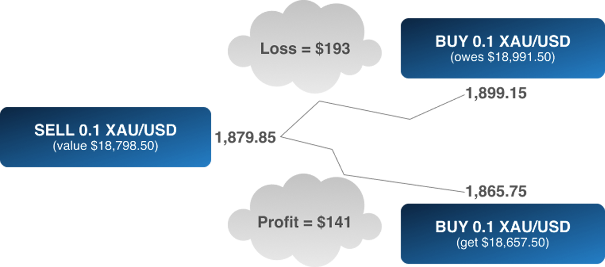 When you go short on XAU/USD, you’re theoretically selling gold for dollars. To close the position, another trade in the opposite direction is used to offset it. Your profit or loss will be calculated in dollars. If the price of gold decreases, you profit and are left with more dollars when you close the position. If gold strengthened, you’d get back fewer dollars.